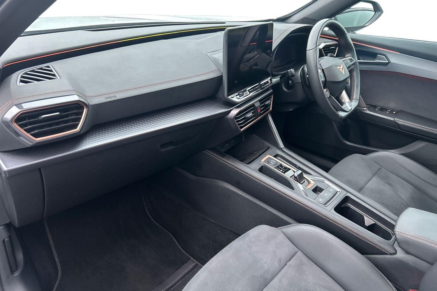 10.25" digital cockpit and configurable dashboard, Adaptive cruise control with follow-to-stop and speed limiter, Advanced driver alert system, Driving profile selection, Dynamic road sign display, Emergency steering support with turn assist, Forward collision warning with automatic braking, Front and rear parking sensors, Full link phone integration, Lane assist, Progressive steering, Rear view camera, RPM, trip computer, outside temp gauge, instrument light brightness, low fuel warning light, lights on reminder, gearshift indicator, Service interval indicator, Start/stop system with regenerative braking, Virtual pedal and electric tailgate, Voice control system, Wired Android Auto, Wireless apple carplay, Wireless phone charger, CUPRA sport suspension, Electronic locking differential and dynamic traction support, 2 front and 2 rear USB type C sockets, Media system with navigation, 12.9" touchscreen display, voice control, DAB, steering wheel mounted controls, Auto dimming rear view mirror, Body colour door handles, Body coloured bumpers, Dark grey wing mirror, Daytime running light with automatic headlight control and coming home feature, Door panel ambient lighting, Dynamic headlight range control, Electric front/rear windows, Electrically adjustable heated and folding door mirrors with memory function, Gloss black roof rails and window surrounds, High beam assist, LED 3rd brake light, LED front fog lamps with cornering function, LED Headlights, LED Taillights with dynamic indicator, Rain sensing wipers, Rear diffuser with black simulated exhaust pipes, Rear fog lights, Rear side wing doors, Rear wash/wipe, Tinted rear windows, Welcome lights (within exterior mirror housing), 12V socket, 2 front and 2 rear reading lights, 3 seat bench in 2nd row, 60/40 split rear bench seat with armrest and mechanical seat release, Black headlining, Black interior roof lining, Cupra sports pedals, Dust/pollen filter, Electrically adjustable front seats with lumbar support and memory function, Front and rear head restraints, Front centre armrest, Heated front seats, Heated supersports multifunction leather steering wheel with satellite buttons and gear shift paddles, Height/reach adjust steering wheel, Illuminated aluminium doorsteps, Illuminated interior front door sills, Illuminated sunvisor with mirror, Isofix, Leather dashboard, door insert and side trim panel, LED smart wraparound lighting, PVC/Dinamica microfiber upholstery + bucket seats, Satellite steering wheel, Single front passenger seat, Storage pockets on rear of front seats, Three zone climate control with control panel in rear, Variable luggage/load compartment floor, 3 point seatbelts on all rear seats, ABS, Brake control system - ESC and brake booster, Child proof door locks, Driver and front passenger airbags with front passenger airbag de-activation, Electronic parking brake, Front and rear disc brakes, Front side curtain airbags, Hill hold control, Public e-call, Seat belt reminder for front and rear seats, Tyre pressure monitoring system, Anti theft alarm system, KESSY Advanced - Keyless start, keyless entry with SAFELOCK, Locking wheel bolts, Copper and aluminium interior detailing, 19" Sandstorm machined sport black and silver alloy wheels