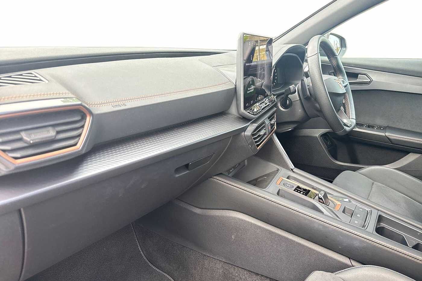 10.25" digital cockpit and configurable dashboard, Adaptive cruise control with follow-to-stop and speed limiter, Advanced driver alert system, Dynamic chassis control with driving profile selection (Comfort, Sport, CUPRA, Individual), Dynamic road sign display, Emergency steering support with turn assist, Forward collision warning with automatic braking, Front and rear parking sensors, Full link phone integration, Lane assist, Rear view camera, RPM, trip computer, outside temp gauge, instrument light brightness, low fuel warning light, lights on reminder, gearshift indicator, Service interval indicator, Speed sensitive power steering, Start/stop system with regenerative braking, Virtual pedal and electric tailgate, Voice control system, Wired Android Auto, Wireless apple carplay, Wireless phone charger, Adaptive chassis control with continuous operation, CUPRA sport suspension, Electronic locking differential and dynamic traction support, 2 front and 2 rear USB type C sockets, Media system with navigation, 12.9" touchscreen display, voice control, DAB, steering wheel mounted controls, Auto dimming rear view mirror, Body colour door handles, Body coloured bumpers, Dark grey wing mirror, Daytime running light with automatic headlight control and coming home feature, Door panel ambient lighting, Dynamic headlight range control, Electric front/rear windows, Electrically adjustable heated and folding door mirrors with memory function, Gloss black roof rails and window surrounds, High beam assist, LED 3rd brake light, LED front fog lamps with cornering function, LED Taillights with dynamic indicator, Matrix LED headlights with multifunction camera, Rain sensing wipers, Rear diffuser with twin exhaust pipe on each side, Rear fog lights, Rear side wing doors, Rear wash/wipe, Tinted rear windows, Welcome lights (within exterior mirror housing), 12V socket, 2 front and 2 rear reading lights, 3 seat bench in 2nd row, 60/40 split rear bench seat with armrest and mechanical seat release, Black headlining, Black interior roof lining, Cupra sports pedals, Dust/pollen filter, Electrically adjustable front seats with lumbar support and memory function, Front and rear head restraints, Front centre armrest, Heated front seats, Heated supersports multifunction leather steering wheel with satellite buttons and gear shift paddles, Height/reach adjust steering wheel, Illuminated aluminium doorsteps, Illuminated interior front door sills, Illuminated sunvisor with mirror, Isofix, Leather dashboard, door insert and side trim panel, LED smart wraparound lighting, PVC/Dinamica microfiber upholstery + bucket seats, Satellite steering wheel, Single front passenger seat, Storage pockets on rear of front seats, Three zone climate control with control panel in rear, Variable luggage/load compartment floor, 3 point seatbelts on all rear seats, ABS, Brake control system - ESC and brake booster, Child proof door locks, Driver and front passenger airbags with front passenger airbag de-activation, Electronic parking brake, Front and rear disc brakes, Front side curtain airbags, Hill hold control, Public e-call, Seat belt reminder for front and rear seats, Tyre pressure monitoring system, Anti theft alarm system, KESSY Advanced - Keyless start, keyless entry with SAFELOCK, Locking wheel bolts, Copper and aluminium interior detailing, 19" Sandstorm machined sport black and silver alloy wheels, Breakdown and tool kit