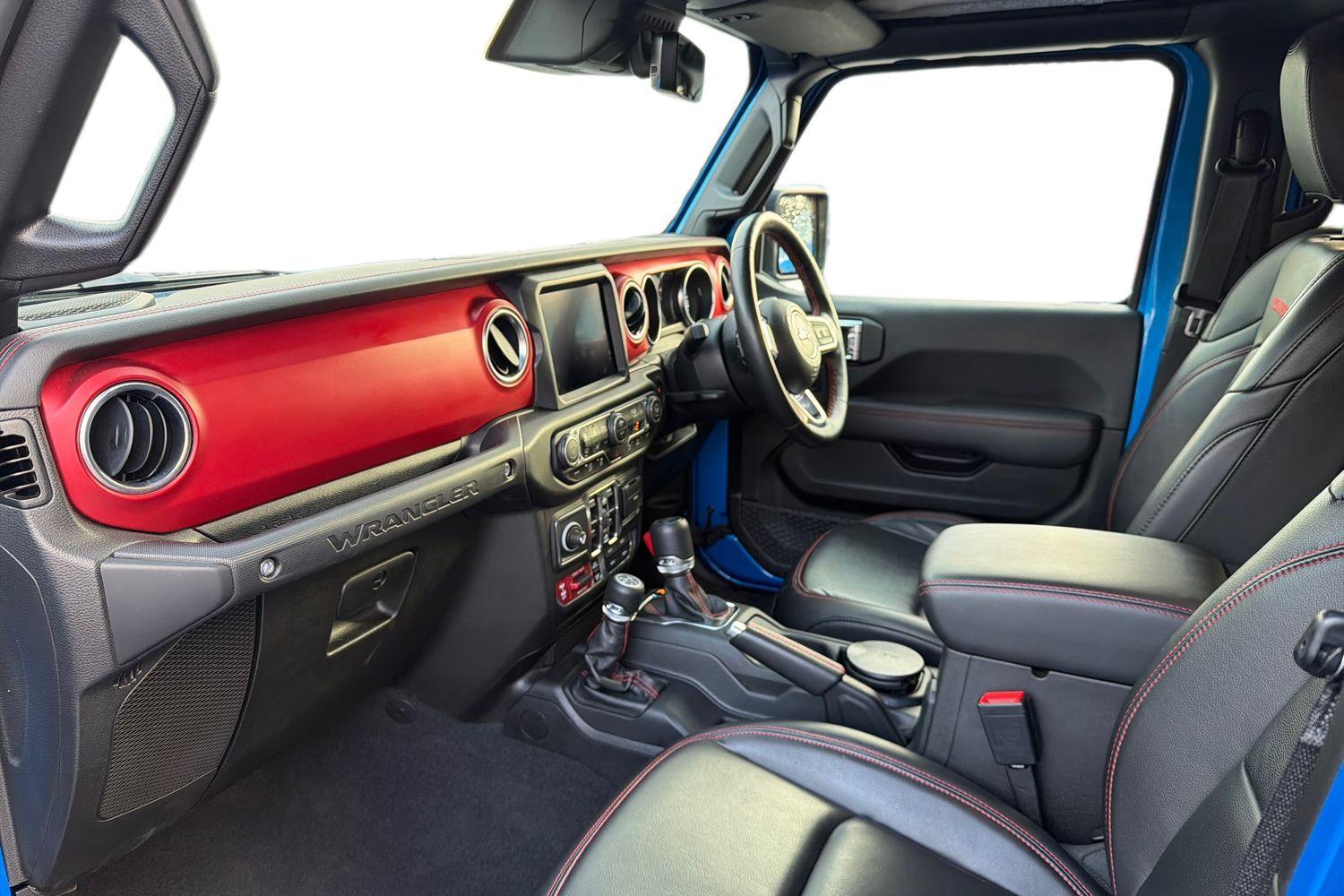 Floor Mats - Mopar Slush, Leather - Black with Rubicon Logo, 12V Auxiliary Power Outlet - Rear, 12V Auxiliary Power Outlet Centre Console, 17in Alloy Wheels - Machine Finish with Black Pockets, 4.10 Rear Axle Ratio, ABS - Anti-Lock Brakes, Active Speed Limiting Device, Airbags - Drivers, Airbags - Front Side, Airbags - Passenger, Ambient LED Interior Lighting, Auto Dimming Rear View Mirror, Auto High Beam Headlamp Control, Black Fuel Filler Door, Bumper - Front Black, Bumper - Rear Black, Cargo Compartment Floor Mat, Centre High Mount Stop Lamp, Climate Control, Connected Services - Europe, Cruise Control, Daytime Running Lights, Deep Tint Sunscreen Glass, Door Mirrors - Black, Door Mirrors - Power Adjustable and Heated, E-Call, Electric Windows - Front One Touch, Fender Flares - Black, Floor Mats - Front and Rear, Front Fog Lights, Front Grille - Body Colour with Accent Colour Grille and Headlamp Throats, Front Sway Bar - Electronically Disconnectable, Front Windscreen Wipers - Variable and Intermittent, Hardtop Headliner, Headlamp Off Time Delay, Headlights - Automatic On, Headlights - Halogen, Headlights - Levelling System, Heated Front Seats, Heavy Duty Electrical Group, Illuminated Front Cupholders, Incandescent Tail Lamps, Instrument Cluster - 7in TFT Colour Display, Interior Accents - Bright, Jeep Mapcare, Keyless Entry, Keyless Go with Push to Start Button, Leather Wrapped Steering Wheel and Shift Knob, Manual 2-Way Adjustable Driver Lumbar Support, Manual 4-Way Adjustable Passenger Seat, Manual 6-Way Adjustable Driver Seat, Off-Road Plus Mode, ParkSense Rear Park Assist System, ParkView Rear Back Up Camera, Power Steering, Premium Alpine Audio System with Subwoofer, Premium Lighting Pack, Premium Low Back Bucket Seats, Rear 60-40 Split Folding, Rear Fog Lamps, Rear Passenger - Seat Belt Alert, Rock Protection Sill Rails, Rubicon Hood Decal, Safety Pack, Security Alarm - Premium, Selec-Speed Control, Selectable Tyre Fill Alert System - STFA, Side Repeater Lamp, Smokers Pack, Spare Wheel Cover - Vinyl, Steering Wheel - Mounted Audio Controls, Storage Tray, Sun Visors with Illuminated Vanity Mirrors, Technology Pack, Telematics Box Module - TBM, Thatcham Security Equipment, Tru-Lock Differentials, Tyre Pressure Monitoring System, Uconnect 8.4in with Navigation, Vehicle Dynamic Stability Control, Vehicle Information Centre, Wrangler Decal