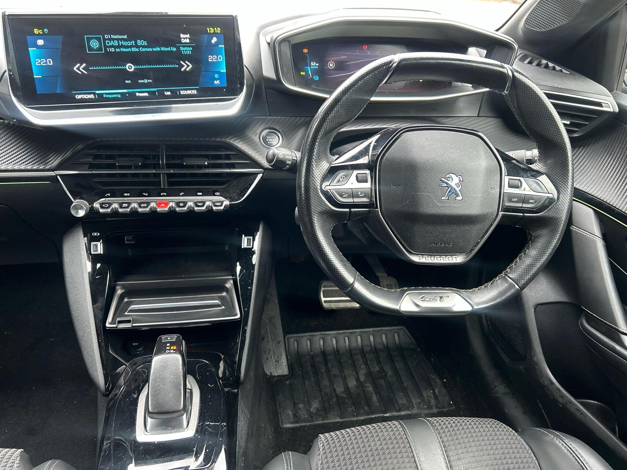 12V Power Socket, 17in Alloy Wheels - Shaw - Diamond Cut Two-Tone, 6-Speaker Radio - MP3 Compatible, 7KW Monophase On Board Charger, 8-Colour Customisable Ambient Lighting, ABS with Electronic Brake Force Distributor EBD and Emergency Brake Assist EBA, AVAS - Acoustic Vehicle Alerting System, Active Safety Brake - Night Function - Cyclists - Pedestrians, Airbags - Adaptive Driver and Front Passenger, Airbags - Driver and Front Passenger Side, Alarm - Thatcham Category 1 Approved, Automatic Door Locking When Moving Off, Automatic Dual Zone Climate Control, Automatic Hazard Light Activation Upon Heavy Brake Application, Blind Spot Monitoring, Bluetooth Telephone Facility, Carpet Mats, Central Front Armrest with Storage Compartment, Child Locking Functionality on Rear Doors, DAB - Digital Audio Broadcasting, Dark Tinted Rear Side and Tailgate Windows, Dashboard - Front and Rear Door Panel Finish - Carbon Effect, Deadlocking, Diamond Black Roof, Dichroic Badging including - Front Lion - E Monogram on C Pillar and Tailgate, Door Mirror Shells - Nera Black, Driver Attention Warning, Driver and Front Passenger Seat Mechanical Height Adjustment, Driver and Front Passenger Sport Seats, ESP - Electronic Stability Programme with Hill Start Assist, Electric - Heated and Power Folding Door Mirrors, Electric Parking Brake, Electric Power Steering with Reach and Rake Adjustable Steering Column, Electronic Code Immobiliser, Exterior Door Handles - Body-Colour, Exterior Temperature Indicator with Ice Warning, Frameless Electrochrome Rear View Mirror, Front Optimised Safety Headrests and Rear Retractable Headrests - x3 - Height-Adjustable, Front Three-Point Retractable Seatbelts with Force Limiters, Front USB Socket x2 including x1 USB-C, Full LED Headlights with Smartbeam Assist, GT Model Designation Badging on Tailgate, Gear Lever - Full Grain Leather and Satin Chrome, Gloss Black B Pillar, Gloss Black Rear Cluster Connecting Strip, Gloss Black Wheel Arch Extensions, Gloss Black Window Surround, Headlights Left On Audible Warning, High Centre Console with 2 Cup Holders, ISOFIX Child Seat Fittings - x2 - Second Row, ISOFIX with Top Tether on Passenger Seat, LED Daytime Running Lights - 3-Claw Headlight with Distinctive Tooth Design, LED Front Interior Light with Reading Spotlights -x2- and Rear Interior Light with Timer, LED Side Indicator Lights Integrated into Door Mirrors, Lane Keeping Assist, Lime Green Contrast Stitching to Armrest - Front Centre Console - Door Panels - Dashboard Fascia, Map Pockets on Front Seat Backs, Mirror Screen - Apple CarPlay and Android Auto, Mistral Full-Grain Perforated Leather Steering Wheel with Aikinite Stitch Detail and Satin Chrome GT Emblem, Mode 3 Type 2 Cable for Wallbox Charging, Model Designation Badges - Front and Rear, Multifunction Trip Computer, One-Touch Electric Front Windows with Pinch Protection, One-Touch Electric Rear Windows with Pinch Protection, PEUGEOT 3D i-Cockpit - Configurable 3D Head-Up Instrument Panel, PEUGEOT Scuff Plates, PEUGEOT i-Cockpit 10in Capacitive Colour Touchscreen with Connected 3D Navigation includes TomTom Live Updates (3 Year Subscription From New), PEUGEOT i-Cockpit Compact Steering Wheel, Peugeot Connect SOS and Assistance, Piano Keys - Gloss Black Plated Toggle Switches to Access Main Functions of Vehicle, Pre-Heating Functionality, Programmable Cruise Control and Speed Limiter, Puncture Kit, Push Button Start, Radiator Grille - Dark Chrome Chequered and Gloss Black Edge Trim, Rear Bumper - Gloss Black Finish, Rear Full LED 3D Peugeot Signature Claw Effect Lights with Daylight Function, Rear Lower Bumper Gloss Black Diffuser Effect Trim, Rear Number Plate Lights x2, Rear Reversing Lights, Rear Spoiler - Diamond Black, Rear USB Socket x2, Rear Windscreen Wiper Triggered Automatically in Reverse Gear, Roof Lining - Mistral Black, Seatbelt Unfastened on the Move Audible and Visual Alert for Front and Rear Seats, Seating - Driver and Front Passenger Seat Manual Adjustment - Longitudinal and Back Rest Angle, Seating- 1-3 - 2-3 Folding Rear Seat, Smartphone Docking Station, Speed Limit Recognition and Recommendation, Tailgate with Heated Rear Windscreen and Wiper Blade, TomTom Live Services (3 Year Subscription from New), Tyre Pressure Sensors, Visibility Pack, Visio Park 1 - 180 Degree Colour Reversing Camera, Voice Recognition - Radio-Navigation-Telephony Features
