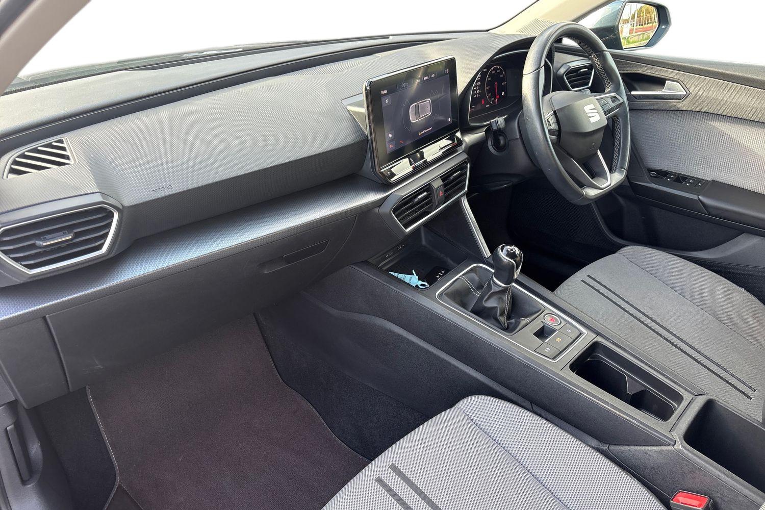Cruise control with speed limiter, Digital cockpit, Front assist with forward collision warning braking reaction to vehicles, pedestrians and cyclists, Full link smartphone integration with Mirror Link, wireless Apple CarPlay and wired Google Android Auto, Lane keeping system, Lockable tailgate, Park assist (inc front/rear parking sensors), Power assisted speed sensitive electro-mechanical steering, RPM, trip computer, outside temp gauge, instrument light brightness, low fuel warning light, lights on reminder, gearshift indicator, Service interval indicator, Start/stop system with regenerative braking, Standard suspension, XDS electronic differential lock and dynamic traction support, Auxiliary input socket, Body colour door handles, Body coloured bumpers, Body coloured exterior mirrors with integrated LED indicators, Dark tinted rear windows, Electric front/rear windows, Electrically adjustable and heated door mirrors, LED front fog lamps with cornering function, LED headlights and LED tail lights, LED rear fog lamp, Manual dimming rear view mirror, Rear wash/wipe, Separate daytime running light with automatic headlight control, 12v power point in centre console, 60/40 split rear bench seat, Air conditioning, Cloth upholstery, Driver seat lumbar adjustment, Driver/passenger manual seat height adjustment, Dust/pollen filter, Folding boot cover, Front and rear height adjustable headrests, Front and rear reading lights X 4, Front seatback storage pockets, Height/reach adjust steering wheel, Interior lighting with LED lighting in sunvisor, glovebox and rear headlining, ISOFIX points in outer rear seats with top tether anchorage points, Leather flat bottomed, perforated steering wheel and leather gearstick, Luggage tie-down hooks, Sunvisors with covered illuminated mirror, Media system plus with navigation - Leon SE, 3 point seatbelts on all rear seats, ABS, Brake control system - ESC and brake booster, Child proof door locks, Driver and front passenger airbags with front passenger airbag de-activation, front side and curtain airbags, Electronic parking brake, Extended safety system - seat belt tensioner, window closure and hazard lights, Hill hold control, Rear disc brakes, Seat belt reminder for front and rear seats, Tiredness recognition system, driver alert system, Tyre pressure monitoring system, Anti theft alarm system with interior monitoring in cab, backup horn and towing protection, KESSY Go (Keyless start), Locking wheel bolts, Chrome interior detailing, 17" Dynamic tri-spoke alloy wheels with 91W tyres, Tool kit